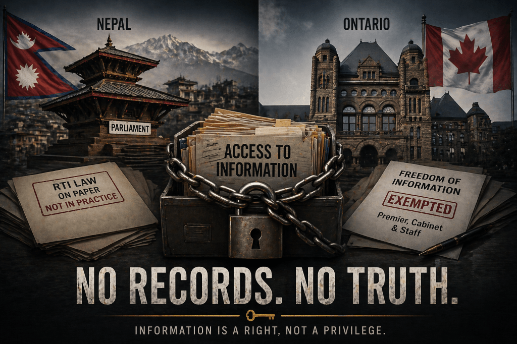 The solution is straightforward but politically difficult. Nepal should strengthen its RTI law. It should mandate timelines for political office responses, create real penalties for non‑compliance, and give the National Information Commission power to compel disclosure. Ontario should reverse its exemptions and recommit to the principle that no public official is above public scrutiny.